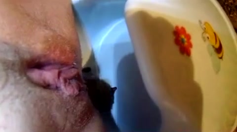 She records her shaved asshole in close up while she's shitting a big one in a blue potty.