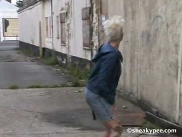 Blonde punk girl is peeing on the ground in a public place. She wiped her wet pussy before leaving.