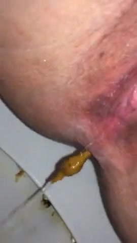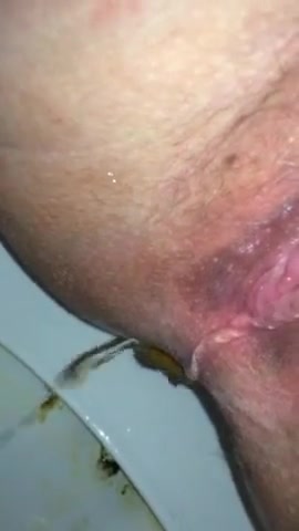 Hot wife sits naked on a toilet while she's pooping a big one. She records her shaved ass in close up.