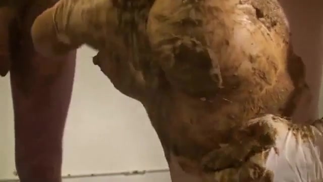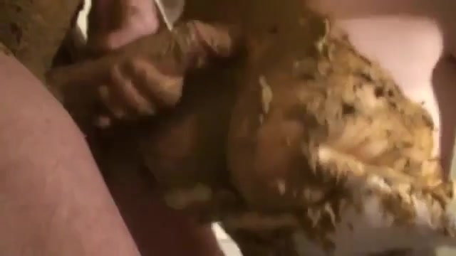 Blonde wife smears fresh poop on her natural tits while sucking husbands cock.