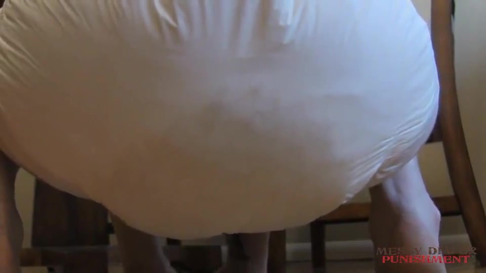 Amateur girl sits naked on her knees while pooping a lot in her white diapers.