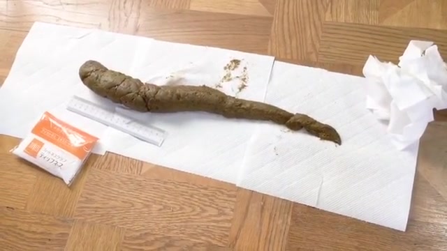 Amateur girl sitting on her knees while she's pooping biggest turd ever on a white napkin.