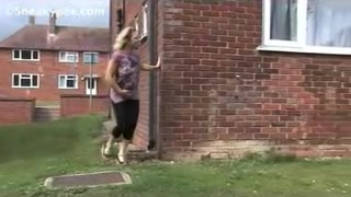 Blonde milf teasing random guys while she's peeing in a public place.