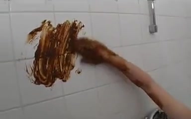Curvy blonde babe pooping on bathroom floor. She smears fresh crap on her face and naked body.