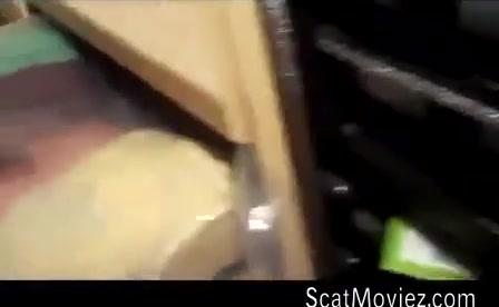 Petite girl spreads her butt cheeks wide opened as she's pooping a big one on wooden table.