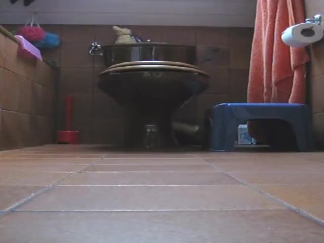 Beautiful German girl sits on her knees while she's pooping on bathroom floor.