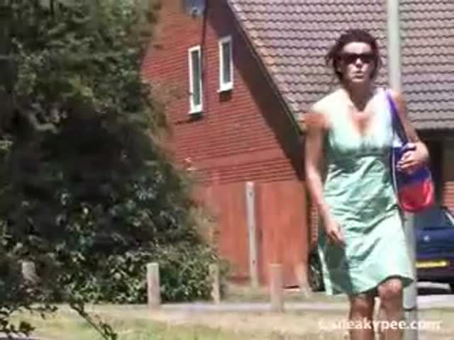 Beautiful dark haired girl peeing outdoor. She slowly spreads her legs wide opened.