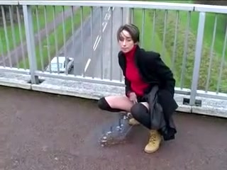 Dark haired girl is peeing with pressure in a public place. She wiped her wet pussy and left like nothing happened.