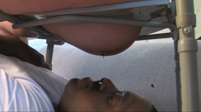 Fat mistress sits with her big ass on a homemade toilet while she's shitting on her black male slave.