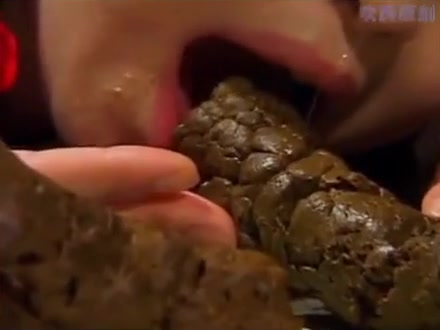 Beautiful Japanese girl sits on her knees while eating fresh poop from the floor.