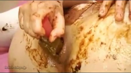 Japanese school girl covered her entire body with poop. She's masturbating with crap until reaching climax.