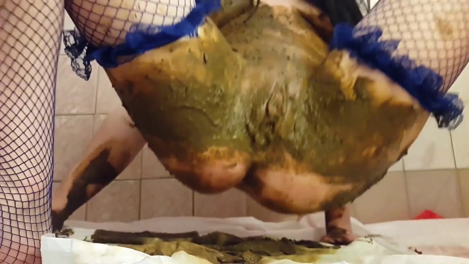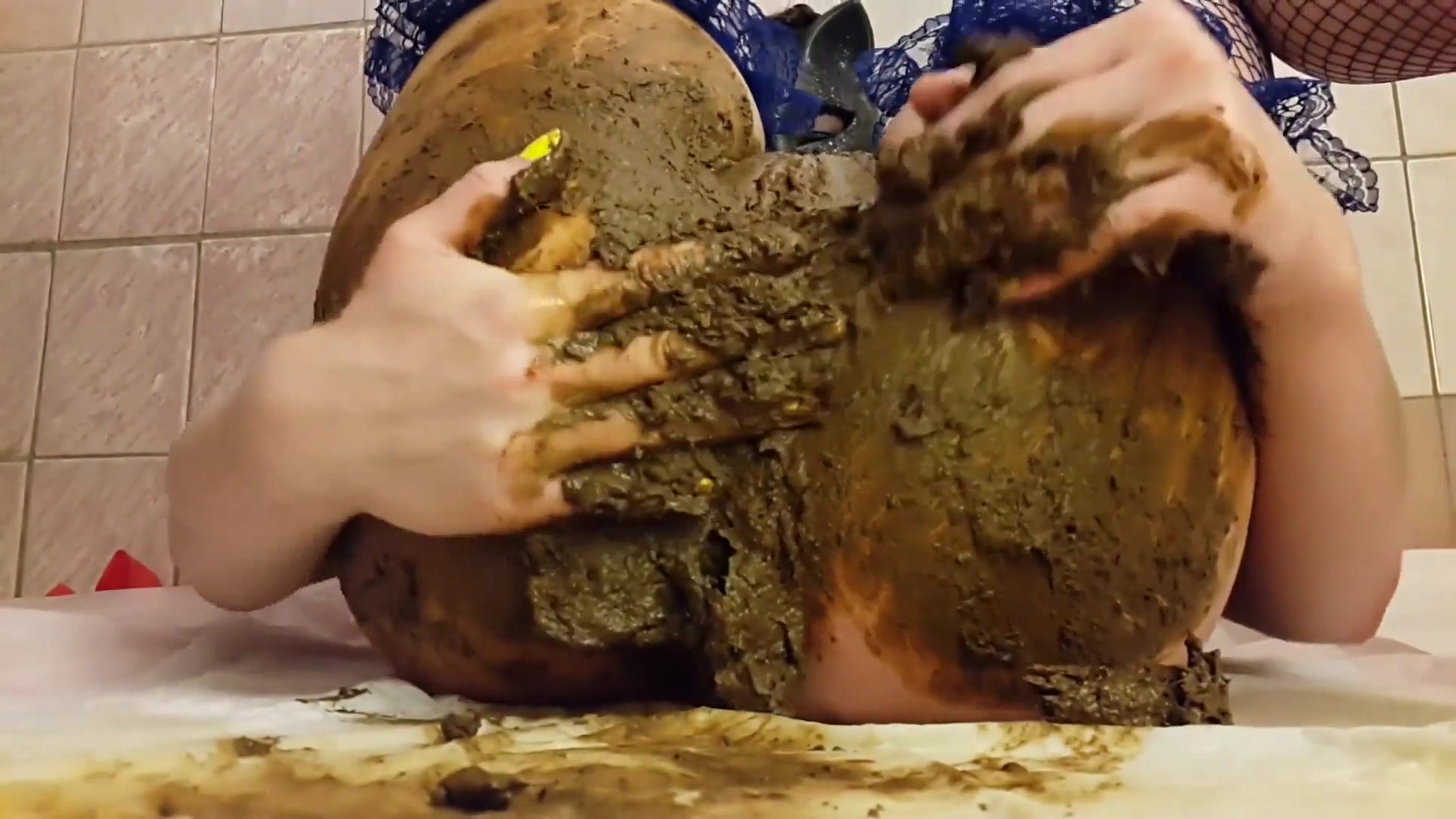 Beautiful college girl wearing lace lingerie while smearing shit on her perfect body. She's eating poop from bathroom floor.
