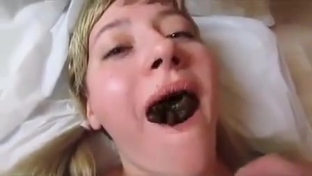 Blonde babe lays naked on her back while a mature man dropped a big one in her opened mouth. She was forced to swallow shit.