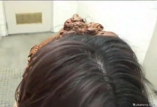 Brunette Japanese girl lays naked on bathroom floor while her boyfriend is shitting on her face.