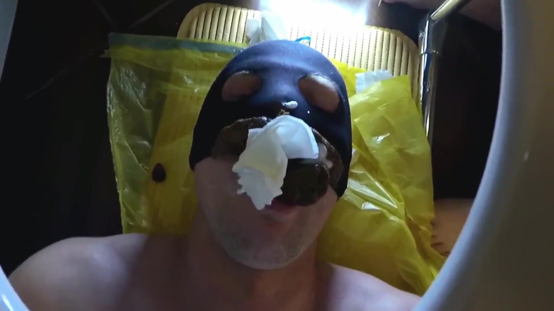 masked teen sits with her sexy ass on boyfriends face. She's pooping and feeding him with poop.