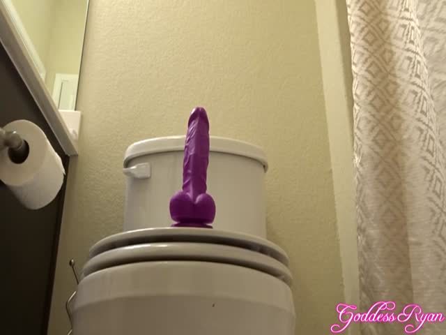 Curvy teen rides a long purple dildo. She starts pooping all over bathroom floor after that.
