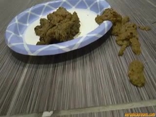 Brunette babe wearing a black tight dress while pooping a lot on bathroom floor.