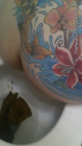 Sexy girl with a big tattooed ass is pooping a long turd in toilet. She didn't wipe her ass before leaving.