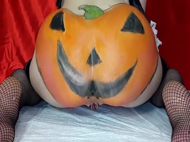 Sexy babe painted her ass as a pumpkin because she wanted to poop in Halloween spirit.