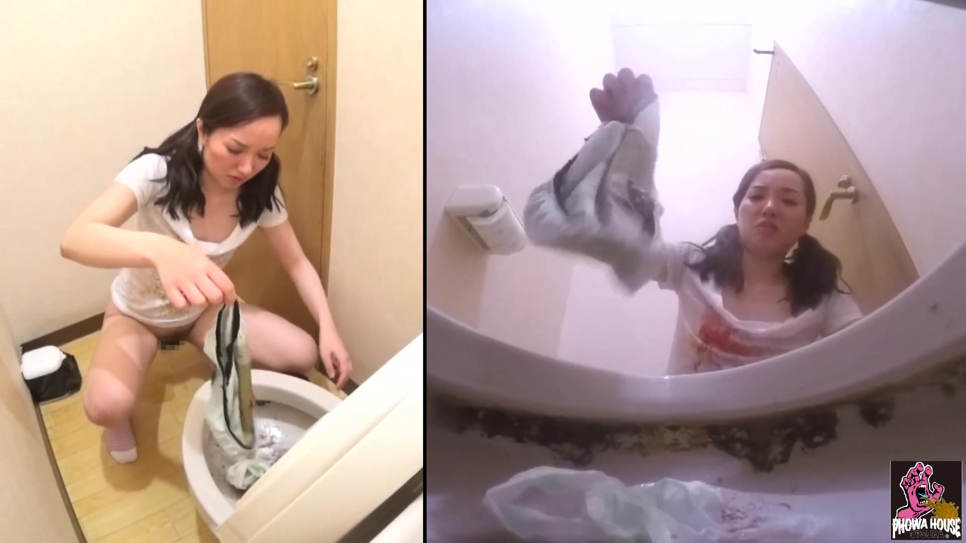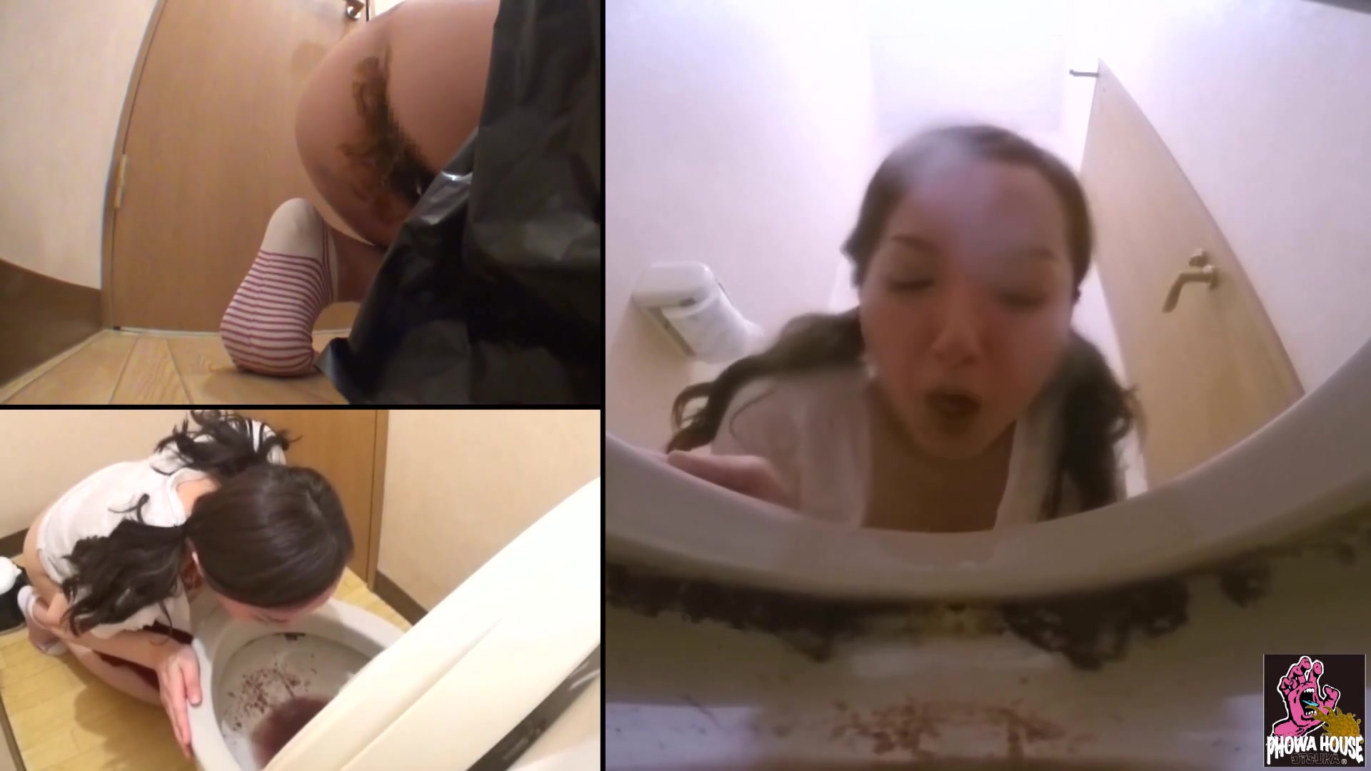 Two japanese girls are feeling sick after eating at fast food. They puked and shit liquid in public bathrooms after that.