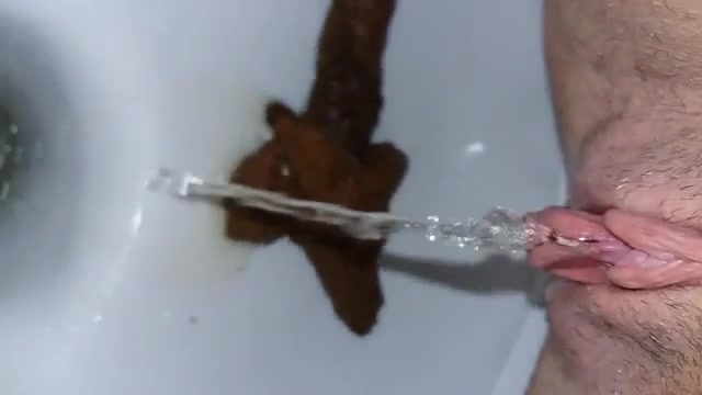 She records her hairy pussy and ass in close up while she's shitting a long turd in toilet.