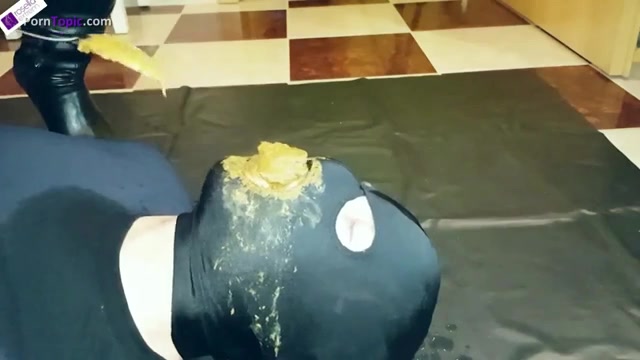 Busty blonde mistress pooping on her slaves face. She's feeding him with a metallic spoon.