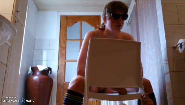 She sits half naked on a white homemade toilet as she's shitting a lot on husbands naked body.