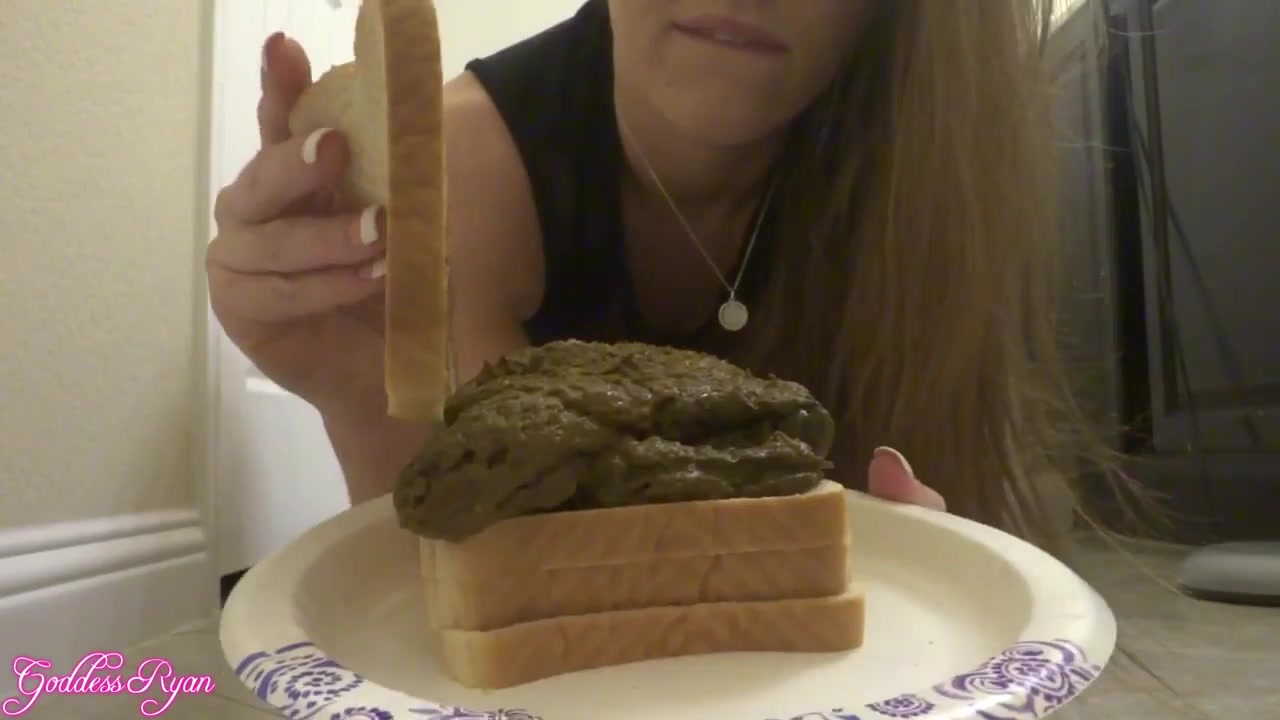 Incredible college girl that's wearing a tight black dress dropped a heavy turd on two slices of bread.
