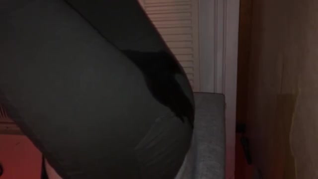 Hot babe shaking her ass in front of the camera while she's peeing and pooping in tight black pants.