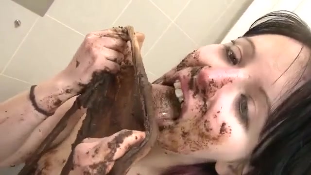 Brunette babe finished pooping in her brown pantyhose. She's using that poop to smear it on her entire body.