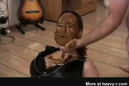 Busty brunette wearing black latex outfit while her dominant boyfriend smears poop on her entire face.