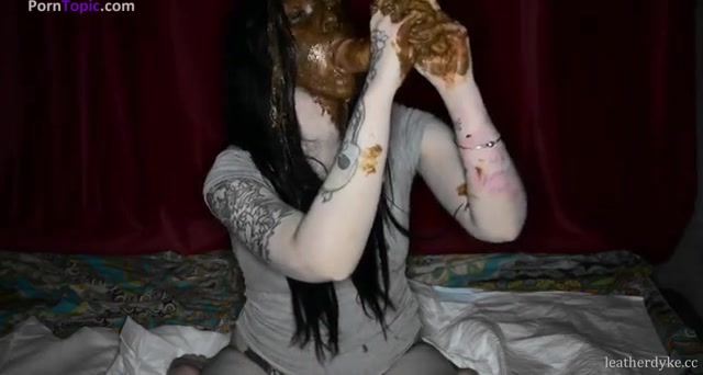 Beautiful brunette model covered her entire face with poop while sucking a long dildo.