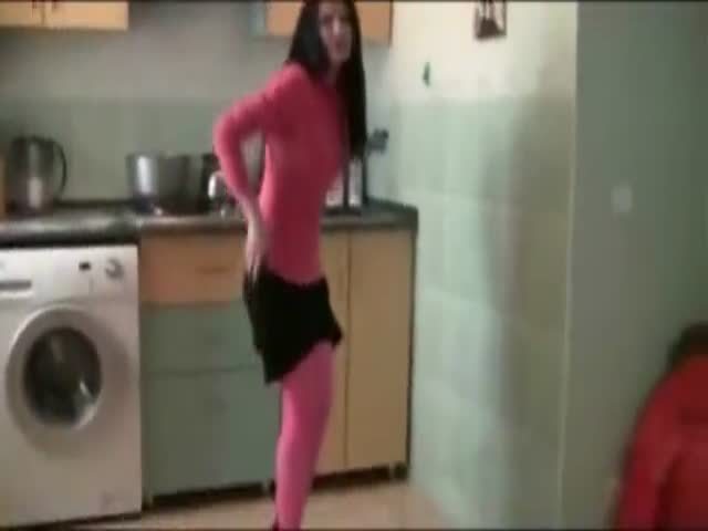 Brunette milf is pooping in pink pantyhose instead of doing the dishes.