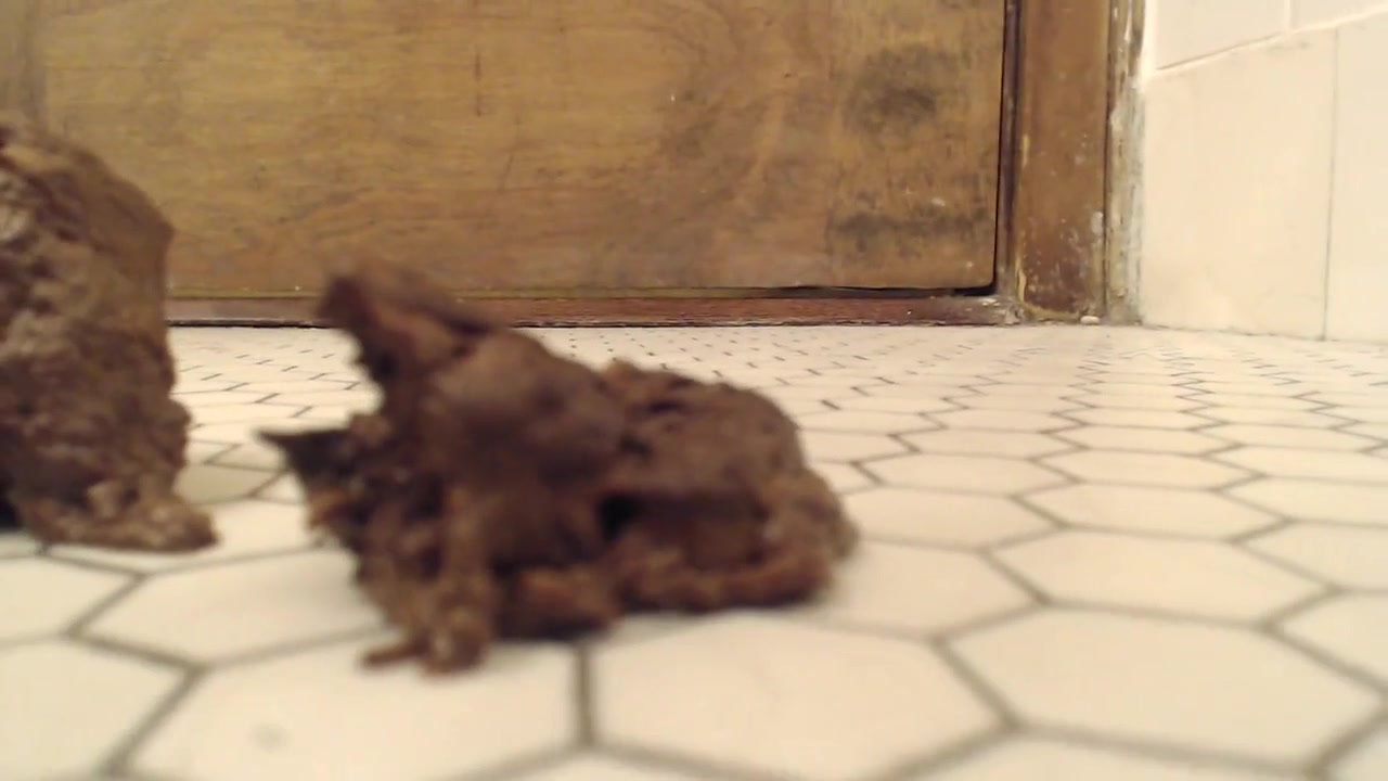 Sexy babe wearing a blue mini skirt while she's shitting on bathroom floor while sitting on her knees.