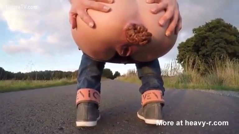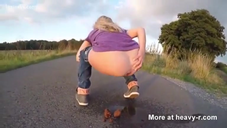 Blonde babe spreads her big ass as she's pooping in the middle of a public road.