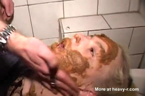 Hairy guy is pooping a big amount of shit on blonde girlfriend's face.