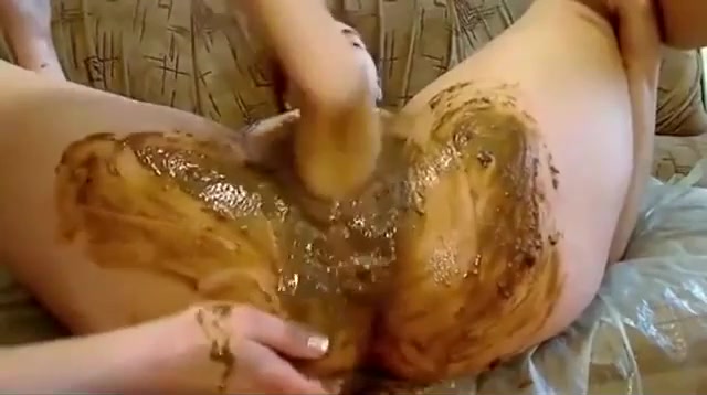 She lets her Russian friend fist her hairy pussy after she finished smearing shit on her ass.