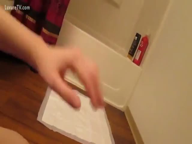 Hot college girl is playing with her shaved pussy while pooping on bedroom floor.