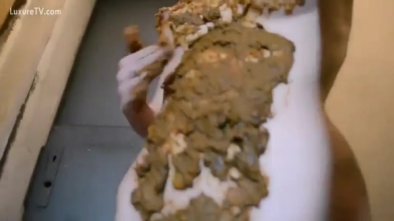 Amazing girl smears fresh poop on her nude body and she's masturbating with it.