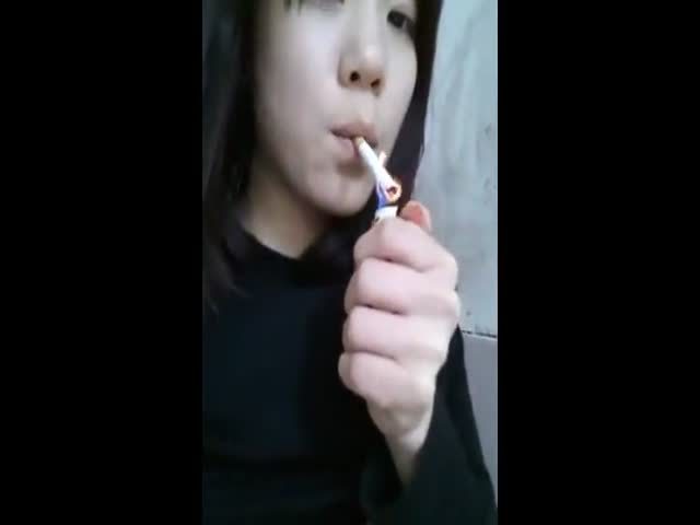 Dark haired girl sits half naked on her knees as she's pooping a big one between her legs. She's smoking a ciggarete in same time.