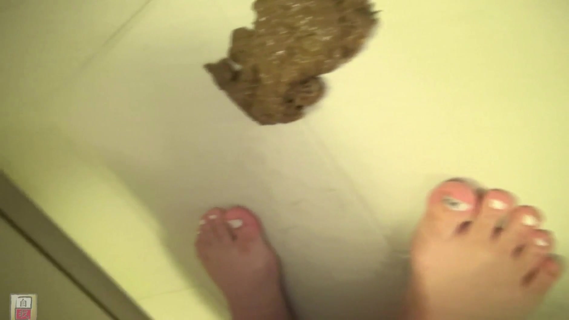 She gets naked in front of the camera and she starts pooping on bathroom floor.