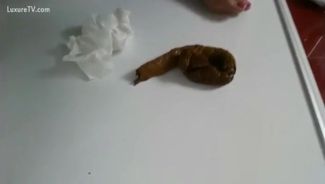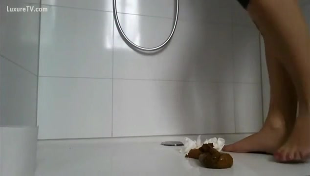 Hot teen wearing a black mini skirt and she's pooping a big one on bathroom floor.