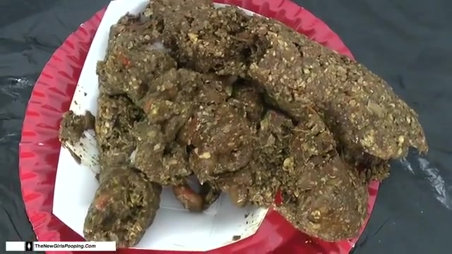 Dark haired babe wearing a tight black dress and she's pooping a lot on a white plate.