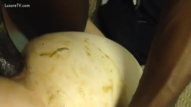 Chubby babe fucked hard in the ass. She's pooping by mistake on that big black cock.