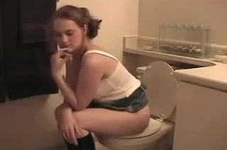 Petite babe wearing tight shorts is pooping over toilet. She wiped her dirty ass with toilet paper.