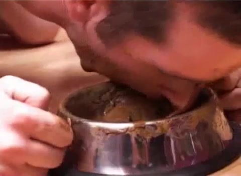 Forced male slave to eat poop from metallic bowl