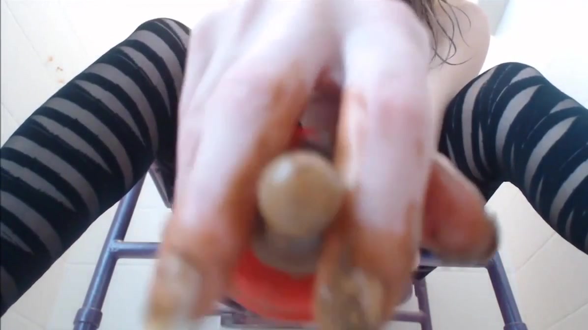 Beautiful babe sits naked on a homemade toilet and she's shitting a lot on floor.
