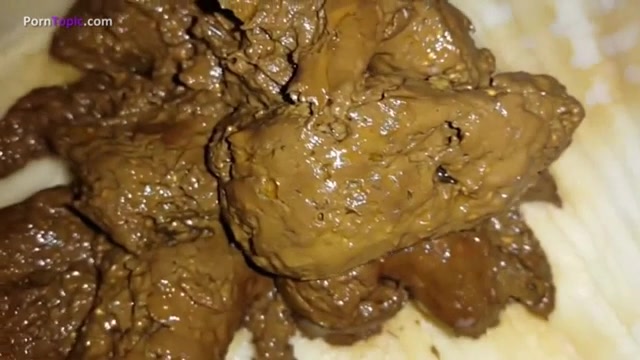 Brunette college girl sits half naked on her knees and she's pooping a lot on bathroom floor.