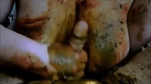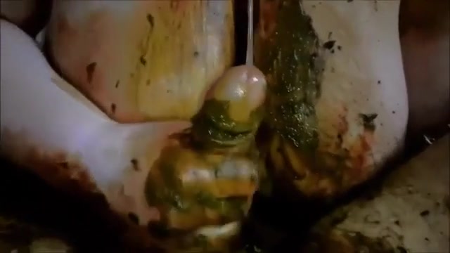 Amateur couple smear poop on their naked bodies. She's playing with her big tits while giving a handjob.