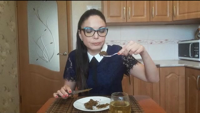 Brunette babe wearing a tight dress and she's eating fresh shit from a white plate.